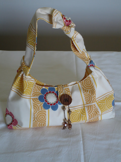 Mala modelo exclusivo, em tecido estampado. Bolso interior, fecho em botão de madeira.