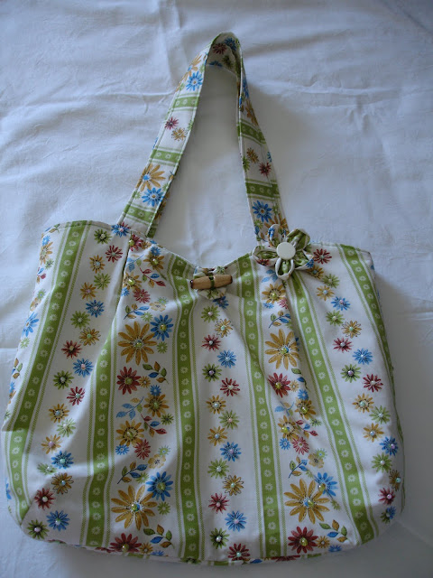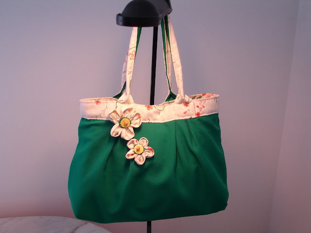 Mala em tecido verde, com detalhes em tecido floral. Forrada, bolsos laterais, aplicação em flores de f