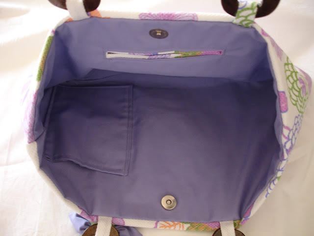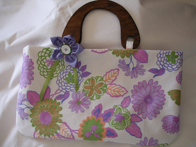Mala em tecido branco floral, com forro em tecido liso na cor lilás, botão íman, bolsos laterais, alças em madeira e aplicação de flor em fuxico.