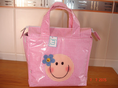 Em tecido plastificado, com fecho em ziper. As lateral podem ser, também, ajustadas, a lancheira fica nesse formato da foto