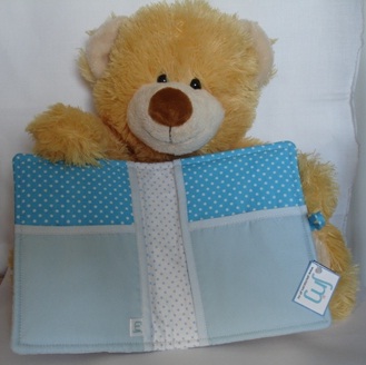 Uma Capa de Boletim de Saúde da Criança, em tecidos poá azul e liso, aplicação de ursinho amovível.