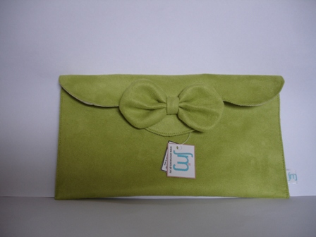 Carteira em imitação de pele, verde claro, aplicação de laço no mesmo material.