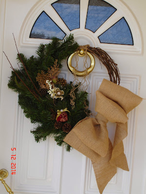Minha guirlanda fiz de forma rústica com galhos secos, enfeites natalinos e um belo laço de serapilheira.